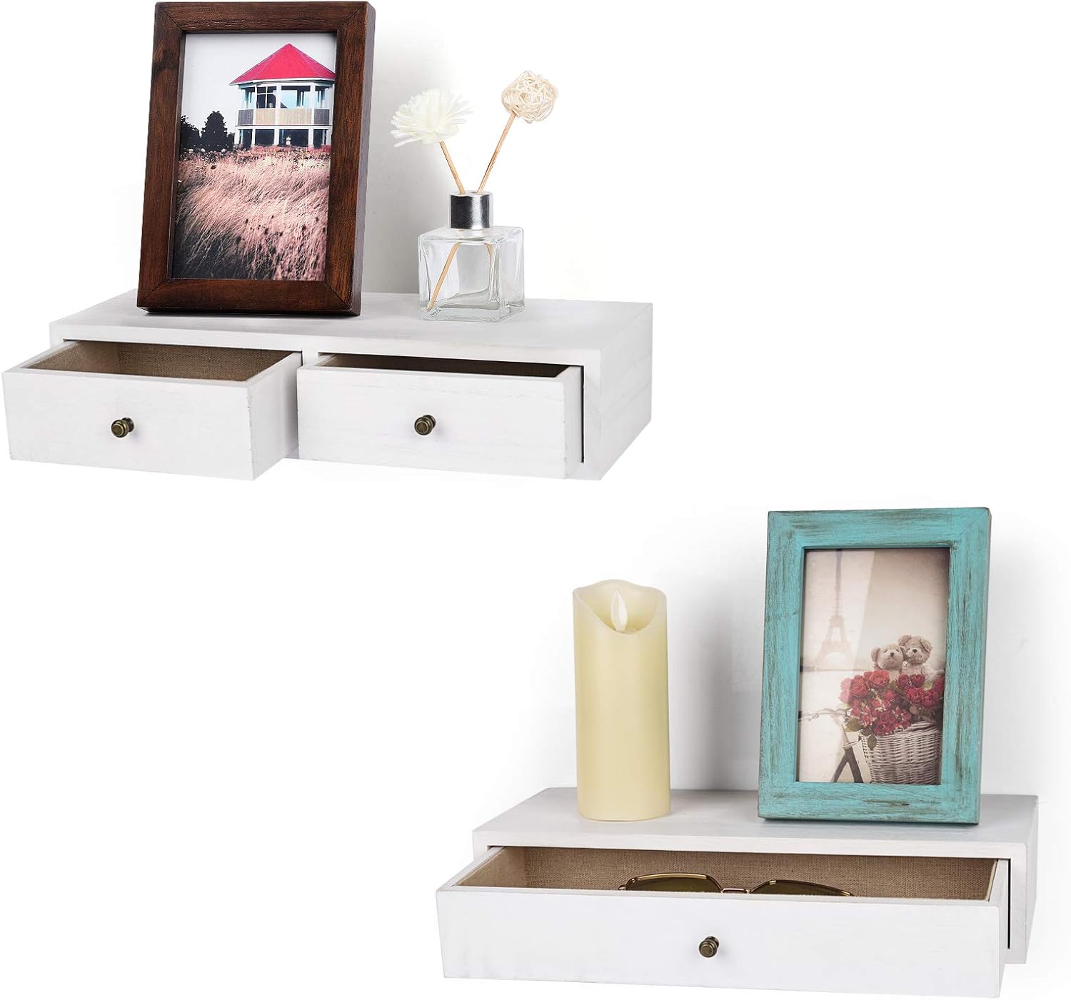 Amazon Com Emfogo Floating Shelves With Drawer Rustic Wood Wall Shelves For Storage And Display Multiuse As A Nightstand Or Bedside Shelf Set Of 2 Vintage White Home Kitchen