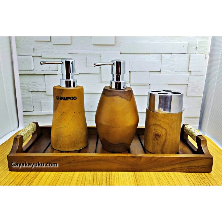 On Sale Wooden Bathroom Accessories Organizer Soap Shampoo Dispenser Set Personalized Boutique Hotel Shopee Indonesia