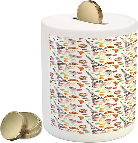 Amazon Com Ambesonne Modern Piggy Bank Europe French Paris Themed Coffee Croissant Macarons Flowers Print Printed Ceramic Coin Bank Money Box For Cash Saving Black And White Home Kitchen